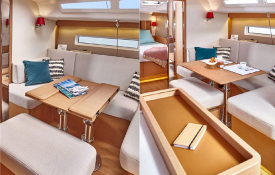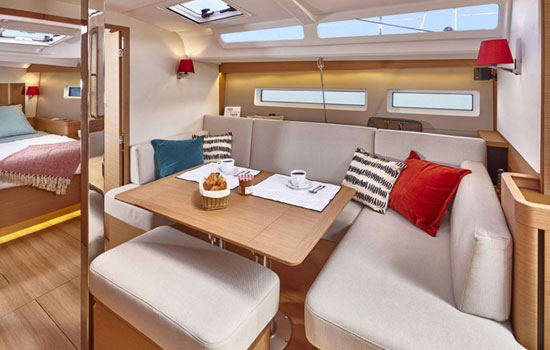 The Sun Odyssey 440 is a high-performance cruising yacht built for comfort and designed for those looking for a fun week of sailing, true to our strategy of offering comfortable blue-water yachts that combine excellent equipment and c large cockpit features a spacious dining area with a large folding table and storage. Twin helm steering keeps the cockpit open, with easy access to the aft transom while moored. The winches are located near the helms, for easy sail handling by a reduced crew. A large sail area offers great performance, while a powerful bow thruster offers the ultimate in manoeuvrability! Inside, the contemporary interior features a spacious saloon with table, convertible to double berth, and a fully equipped galley.